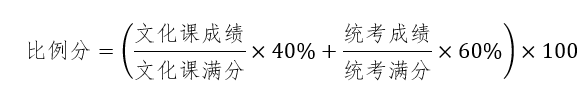 在实行平行志愿的省份,按照投档成绩从高到低的顺序择优录取。在实行顺序志愿的省份,按照比例分(四舍五入、保留小数点后两位)从高到低的顺序择优录取。比例分满分为100分,计算公式为: