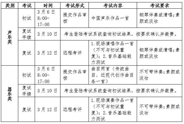 2.考生报考省级统考已涵盖的专业,须参加省级统考且成绩合格。学校各专业与省级统考科类对应关系如下:绘画为美术学和设计学类、书法学为书法学专业、音乐学(音乐国际教育与传播)为音乐学类。